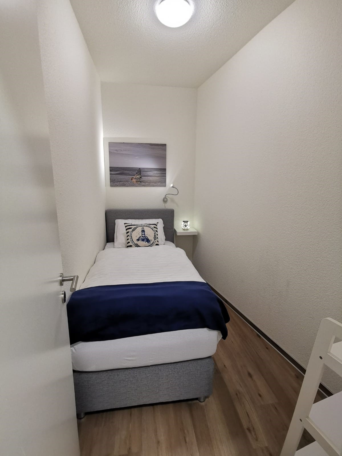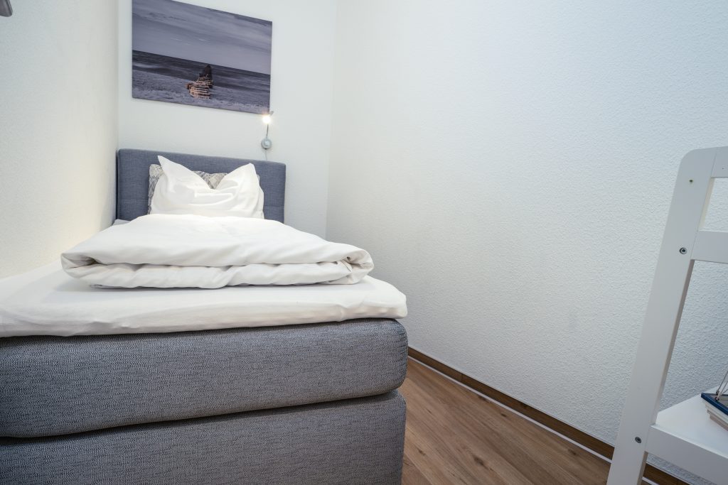 Unser kleines Schlafzimmer im inneren der Wohnung ohne Fenster bietet ein Boxspringbett 90x200m und Abstellmöglichkeit für Ihre Kleidung.